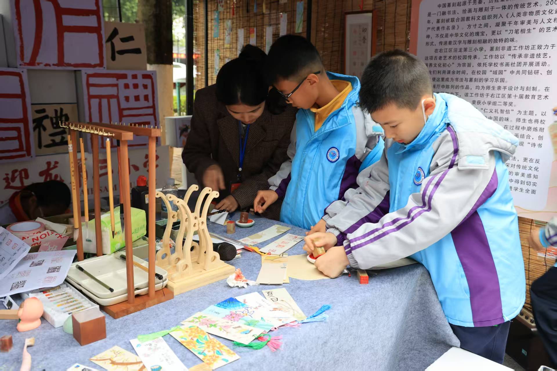 傍晚時分,非遺手工藝品與書畫展區(qū)率先成為關(guān)注焦點。剪紙、扎染、皮影、手工刺繡等非遺體驗臺前圍滿學生,不少人在老師指導(dǎo)下親手制作,感受傳統(tǒng)技藝的魅力。展區(qū)不僅展示作品,更成為互動課堂,學生們擔任“講解員”,分享創(chuàng)作心得,傳遞文化自信。一旁的書畫展區(qū)則匯集了全區(qū)各校精選作品,一幅幅充滿童趣與想象的書畫,勾勒出右江學子眼中的美好世界。