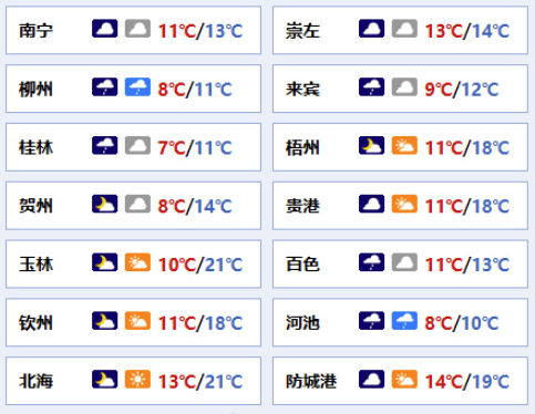 南寧市:陰天、局地有零星小雨,東北風2~3級,最低氣溫11℃,最高氣溫13℃。