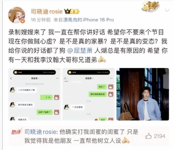 1月3日,網(wǎng)紅“司曉迪rosie”在爆料多名藝人時,重提演員屈楚蕭“家暴”女友何女士的舊聞。4日凌晨,屈楚蕭工作室發(fā)長文回應(yīng),并公開2022年10月24日的二審判決書,稱“何女士于庭審中承認自己發(fā)布相關(guān)微博時并未懷孕,屈楚蕭亦未對其有暴力毆打行為”。【詳訊】