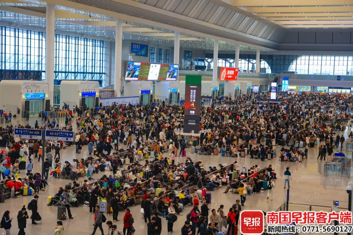 節(jié)日期間,南寧東站候車大廳人潮涌動。