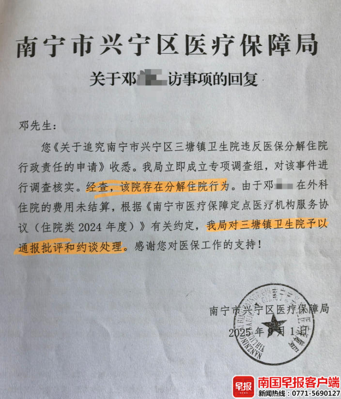 事后,鄧先生向南寧市興寧區(qū)醫(yī)療保障局投訴院方分解住院問題。2025年9月,該局調(diào)查后回復(fù),該院存在分解住院行為,依據(jù)相關(guān)規(guī)定對該院予以通報等處理。