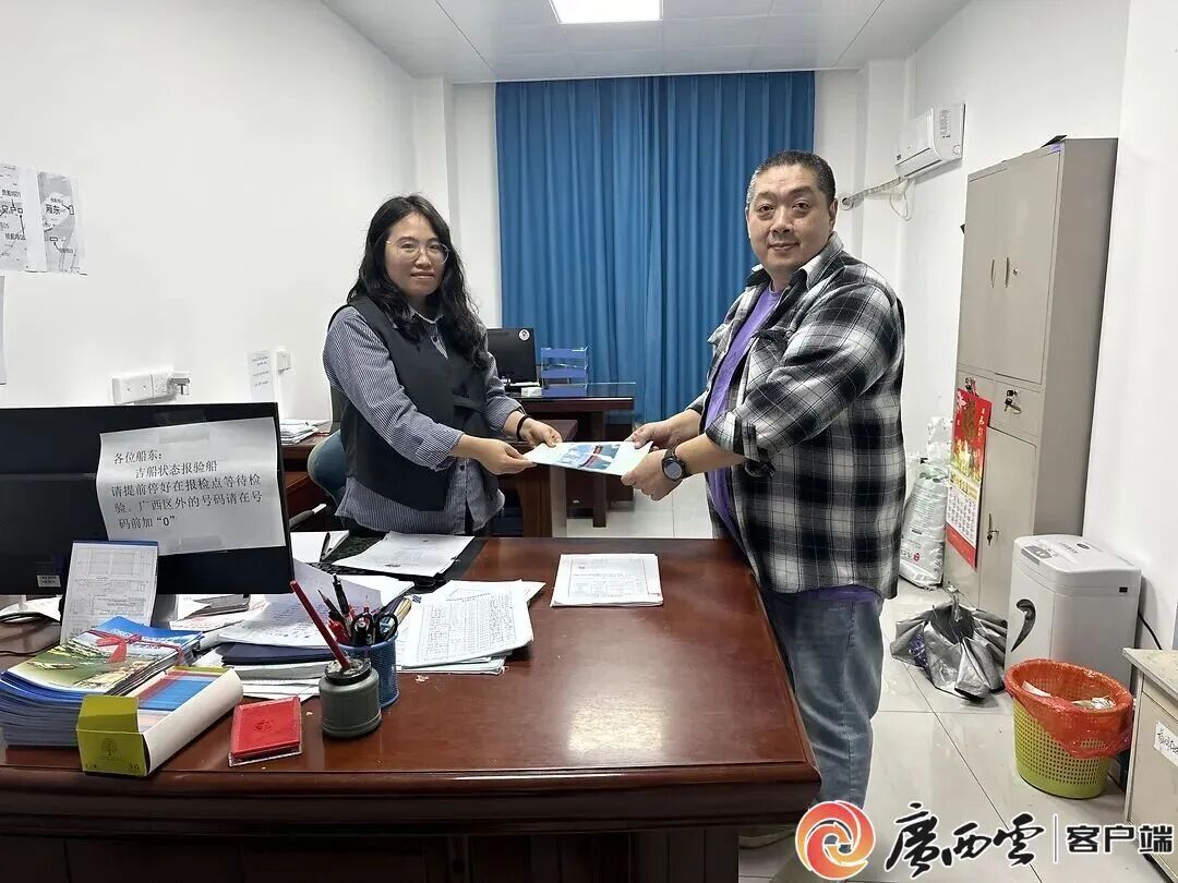 “翔航001”船船主從貴港船舶檢驗(yàn)中心相關(guān)負(fù)責(zé)人處領(lǐng)到廣西首張經(jīng)平陸運(yùn)河出海的內(nèi)河船舶證書。
